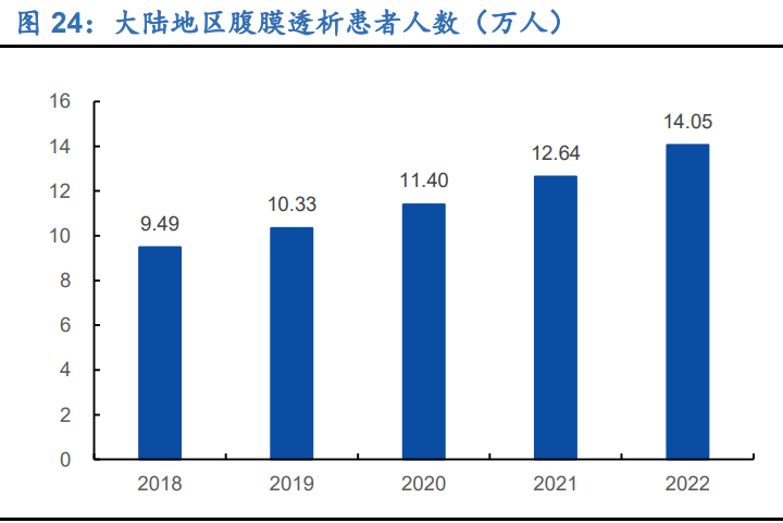 腹膜透析的基本原理是利用腹膜作为透析膜,把灌入腹腔的透析液与血液分开,腹膜 有半透膜性质,并且具有面积大、毛细血管丰富等特点,浸泡在透析液中的腹膜毛细血管腔内的血液与透析液进行广泛的物质交换,以达到清除体内代谢产物和毒物,纠 正水电解质、酸碱平衡失调的目的。近年来接受腹膜透析的患者数量在大陆地区稳定 增长,但腹膜透析市场并不会侵占血液透析市场空间。在治疗中,患者通常自助购买 药液在家自主操作,流程较为便利,但由于医院无法对安全进行把控,患者伴随着潜 在感染风险,因此大陆地区医院并不将腹膜透析作为最优先的推荐治疗方式。此外, 长期做腹膜透析会导致腹膜炎、腹膜硬化,最终需转为血透治疗。全球范围来看,腹 膜透析在香港较为普及源于政府推广和家庭医生模式的影响,其他国家或地区均以 血液透析为主。2022 年中国大陆地区腹膜透析患者人数 14.05 万人,以 2020 年中 国 ESRD 总患者数 330.52 万人为基数计算,腹膜透析渗透率为 3.45%。